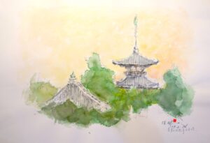 村岡信明『春宵の法起寺 三重塔 奈良』 デッサン・水彩